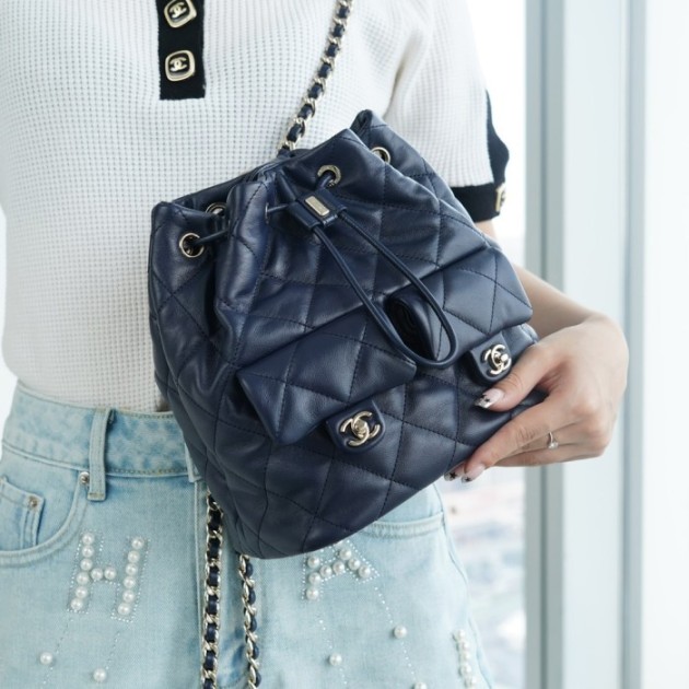 팬더샵 샤넬 카프스킨 투포켓 드로우스트링 버킷 백팩 네이비 금장